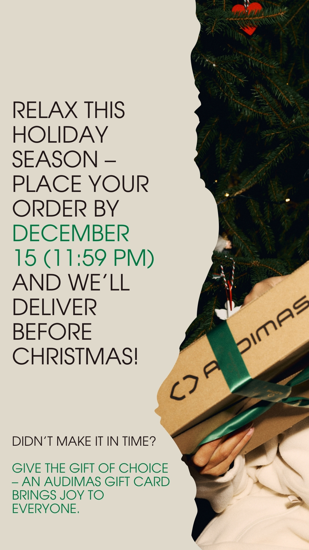 Relax this holiday season - place your order by December 15 (11:59 PM) and we'll deliver before Christmas!